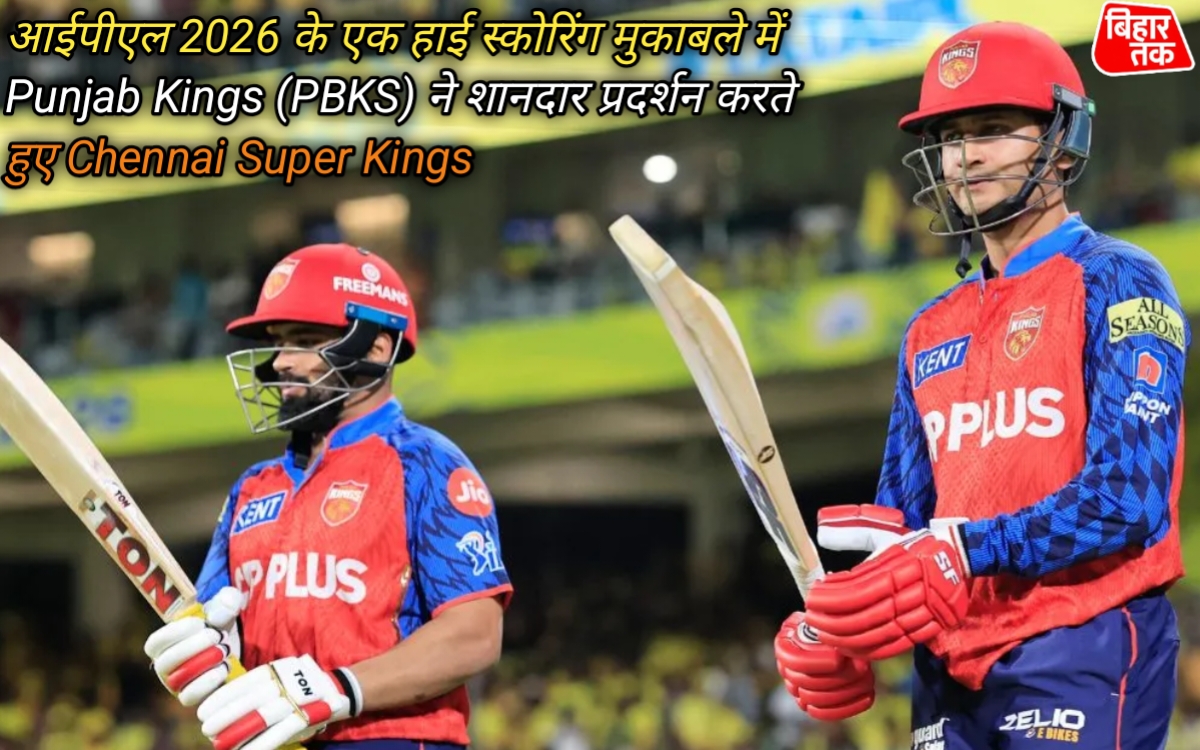 आईपीएल 2026 के एक हाई स्कोरिंग मुकाबले में Punjab Kings (PBKS) ने शानदार प्रदर्शन करते हुए Chennai Super Kings (CSK) को 5 विकेट से हराकर बड़ी जीत दर्ज की। चेन्नई के घरेलू मैदान पर खेले गए इस मुकाबले में बल्लेबाज़ों का जलवा देखने को मिला लेकिन अंत में पंजाब की टीम ने बेहतर फिनिशिंग के दम पर मैच अपने नाम कर लिया।